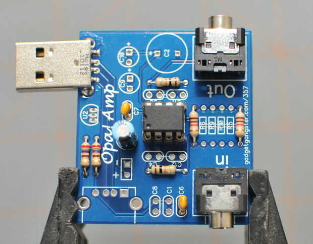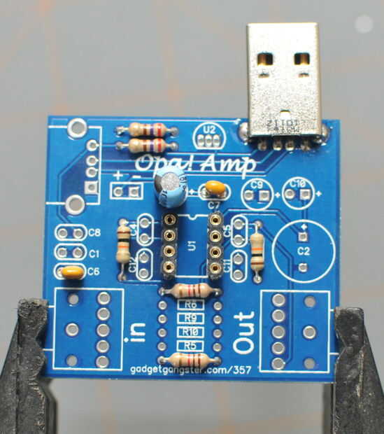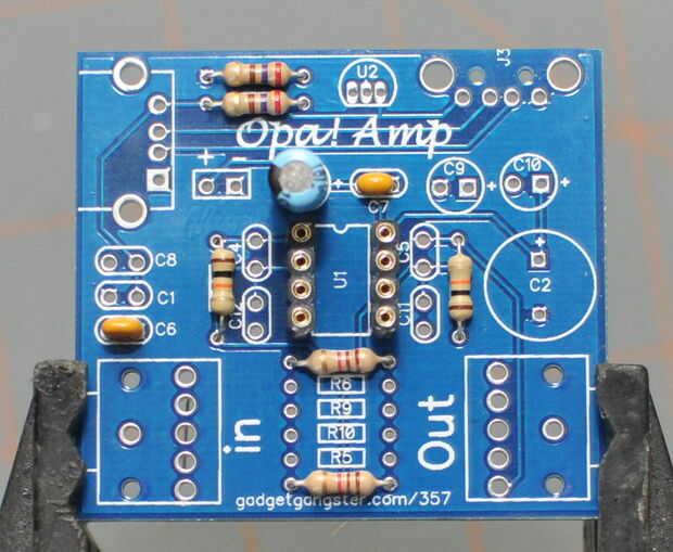 Añadir los auriculares en las cajas marcadas 'En' y 'Out'. Por último, añadir el Op Amp, tenga en cuenta la muesca de la viruta se alinee con la ranura del tablero.