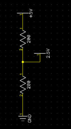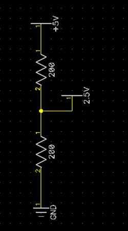 El OPA2227 también necesita una partida de alimentación (+ V, AGnd y – V). La forma más sencilla de hacerlo es hacer + V 5V de la fuente de alimentación USB, -V será tierra de la fuente de alimentación USB y nuestra tierra analógica será el punto medio (2.5V). Creamos el punto medio (también conocido como tierra virtual) con el divisor de resistencia;