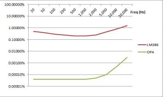 Mientras que el LM386 tiene distorsión de alrededor del 1% a 20kHz, el OPA2227 mide alrededor. 0001%, o un diez milésimas del uno por ciento. La OPA también puede ejecutar menor ganancias, que nos permite mantener niveles de entrada alto en comparación con cualquier posible ruido o interferencias.