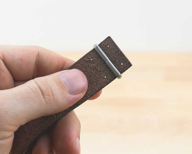 • Deslice uno de los encargados de la correa en el extremo cuadrado de la correa. La costura en el encargado debe estar en el lado ante de la correa.