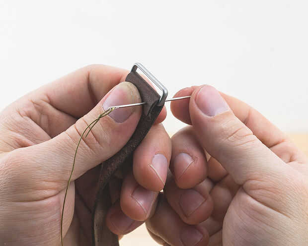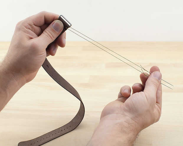 • Hale la aguja a través de, por lo que una misma longitud de hilo a cada lado de la correa.