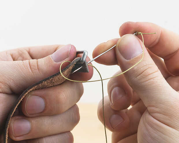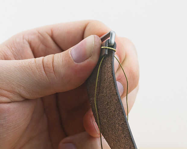 • Lazo de una de las agujas alrededor de los bordes de la correa e inserte en ese lado sólo el agujero costura. Este hilo debe estar ahora entre las dos capas de cuero.