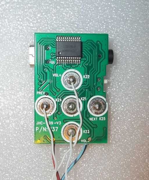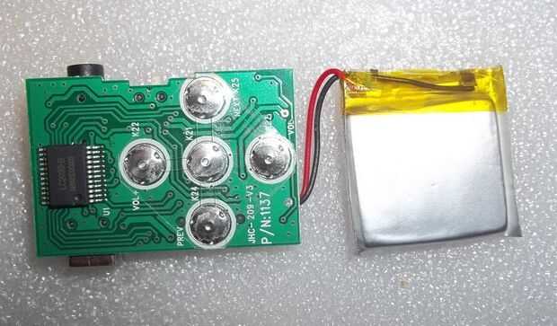 Para integrar el reproductor de MP3 retiramos la placa de circuito de MP3 de su caja de clip. También desconectada la batería dedicada de reproductores de MP3 y conectó los terminales 5.5v y tierra de Arduino. Porque sólo tenemos un archivo de mp3 (4 horas de largo) en nuestro reproductor, sólo necesitábamos el arduino para tener acceso y control sobre el botón "anterior" en el reproductor de mp3. Por lo tanto se suelda el alambre dejando el pin número 5 en el arduino al círculo conductor centro del botón central. ** Nota la foto de arriba tiene soldadas a más entonces sólo el botón anterior. Para nuestro proyecto, esto no era necessary.* *