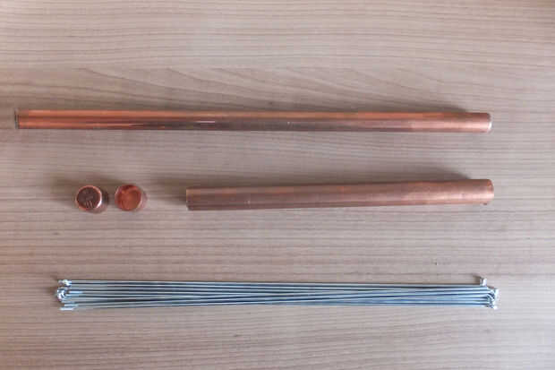 Puñado de aprox. 2mm diámetro radios de bicicleta (1/16 de pulgada), no puedo dar un número exacto, verás por qué en un poco. Asegúrese de utilizar radios de acero inoxidable, vas a comer fuera de ellas.