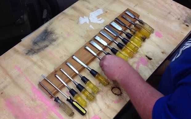 utilizando un lápiz y el cincel para marcar las líneas en cada lado del cincel para definir el corte
