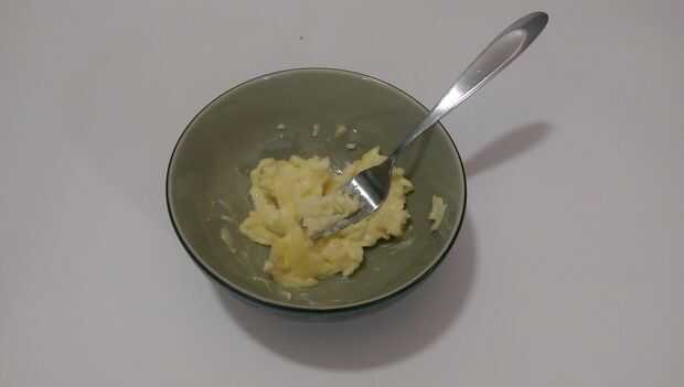 Preparar mantequilla de ingredientes adicionales de batir con un tenedor. Añadir una pizca de sal gorda y mezclar bien.