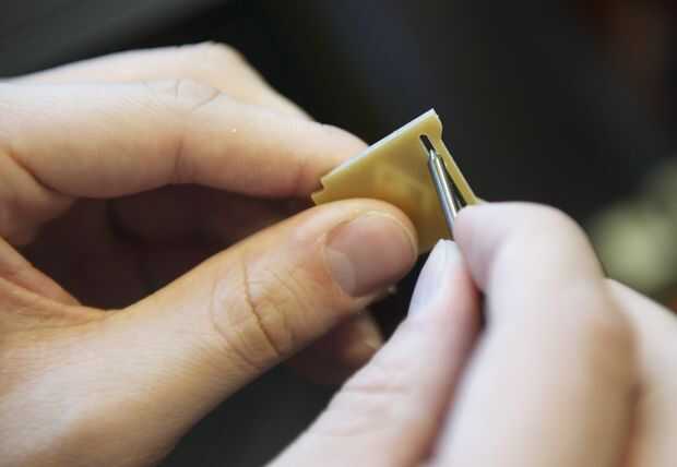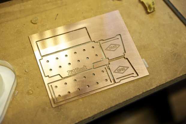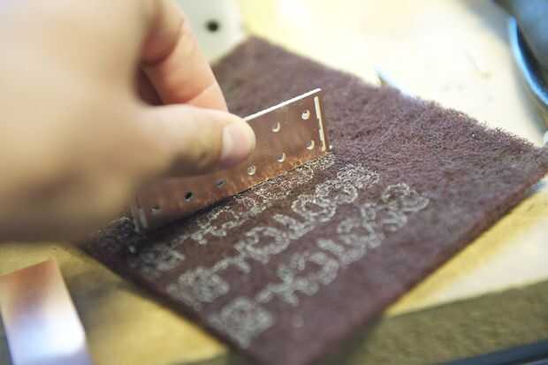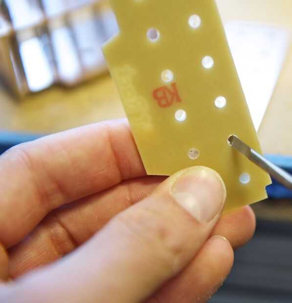 Cuando se realiza el corte, retire las piezas de la cama y limpiar los bordes con una almohadilla Scotch-Brite. Utilizamos una herramienta de desbarbado para limpiar los agujeros, pero un poco de grabado funcionará también. También utilizamos la broca grabado para limpiar y biselar las ranuras presionando y deslizando la forma cónica afilada a través de las ranuras.