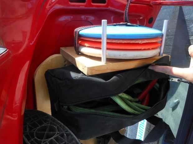La parrilla de golf del disco es otra perpendicular a mi bandeja, con dos barras de aluminio y una correa del dedo del pie. Cuando el tronco está cerrado, las barras de soporte los discos desde la parte inferior y la correa les mantiene en su lugar.