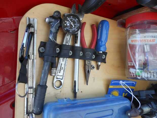 Esta es una sección de un tubo de bicicleta de 700 c corte a la longitud y atornillados a diferentes distancias para sostener cómodamente herramientas específicas. Tengo una bomba de descarga, 8" llave métrica allen clave algo he tenido siempre, alicates y un destornillador 4 en 1 aguja.