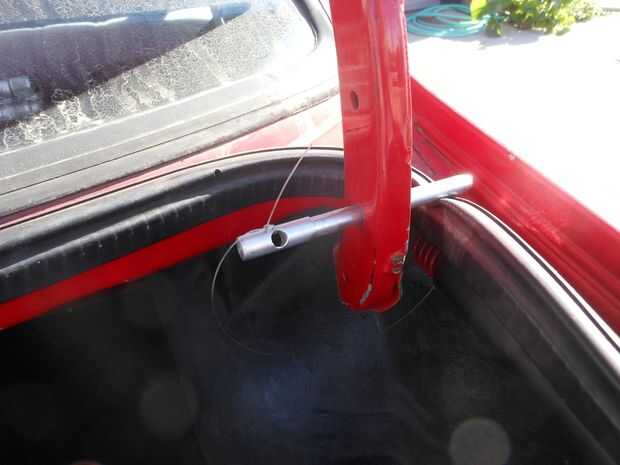 El peso adicional en su tronco puede hacer su tronco quiere cerrar en sí mismo cuando abrió. Cuando me estaciono en terreno plano, mi tronco se mantiene erguido, pero si estoy apuntando hacia arriba el tronco necesita algo de ayuda. Trabajado a máquina un perno de aluminio que encaja en un orificio situado oh-tan-buena que Volkswagen ha añadido cuando hicieron este coche. El perno de seguridad funciona excelente en mi caso, pero puede no en el tuyo. Utilicé algunas lineas de pesca para atarla a un punto dentro de mi tronco así siempre no donde está el pin. Usar este pin con moderación aunque, como se puede ver que quiere deformar ese punto en mi sello de tronco.
