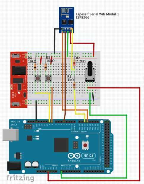 Tenga en cuenta que el circuito es básicamente el mismo que el post anterior, acabo de añadir dos botones (normalmente abierto) conectados a la Arduino entradas y VCC (a través de un resistor de 10K para no generar un corto circuito, por supuesto). Pulsando el botón, lo que estamos haciendo es poner una señal de alta en la entrada digital de Arduino. El potenciómetro (también 10K) se montará entre VCC (5V) y la tierra, con su perno de centro conectado a A0 entrada analógica de la MEGA. El potenciómetro controla el nivel de voltaje en el A0 entrada analógica, que van desde "0V a 5V." MEGA va a leer el voltaje en el pin AO y su interior ADC (convertidor Digital analógico), convirtiéndolo en un valor que van de "0 a 1023".