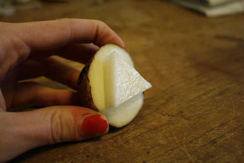 Luego cortar a la circunferencia de la patata para exponer la forma de triángulo.