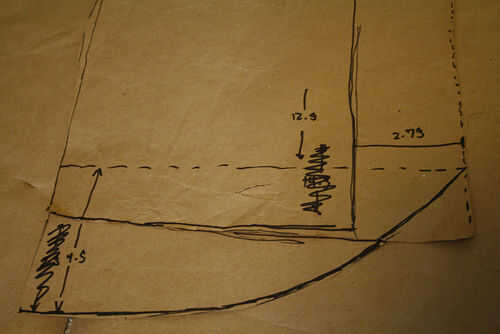 6. medir 12,5 pulgadas de la línea que trazaste en el paso 2 (la línea de la axila). Esto es donde termina el dobladillo de la parte delantera de la camisa. Dibuje una línea horizontal aquí para marcar el dobladillo