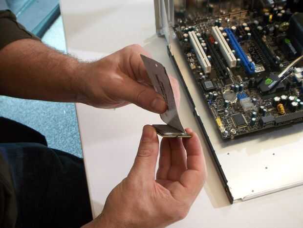 Ahora aplicar poco de pasta térmica en la parte superior del chip y extenderlo uniformemente por toda la superficie. Alinee la muesca en el chip con la muesca del zócalo. Cierre la tapa y el pestillo de la cerradura. Coloque el disipador de calor sobre la parte superior del chip y asegúrelo con los tornillos suministrados.
