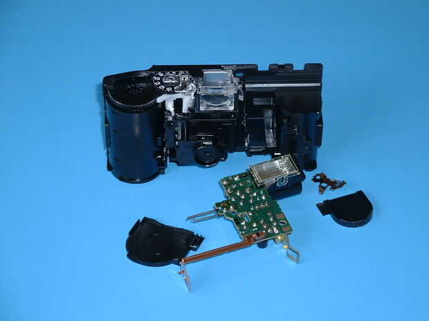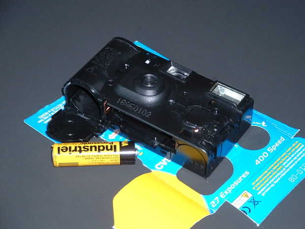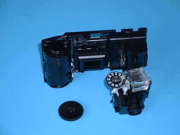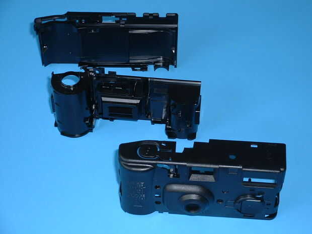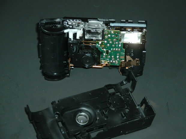 Quitar las dos aletas de plástico en el fondo de la cámara, el interior mecanismos y óptica y la contraportada.