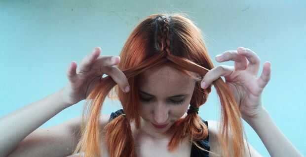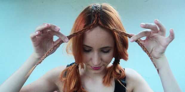 La sección se dividen en dos y cada mitad de la trenza hacia abajo en una trenza normal. Ate los extremos con un elástico transparente.