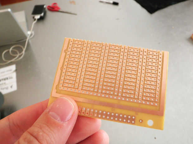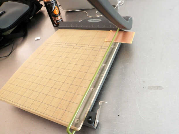 Corte la placa de circuito por la mitad, sólo tendrá la mitad de ella. Un cortador de papel funciona bien para tableros de circuito de corte. Si no tienes un cortador de papel, tijeras viejas regulares trabajan bastante bien también.