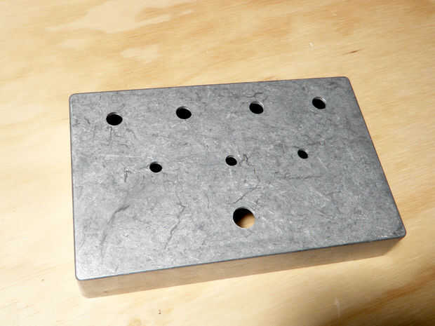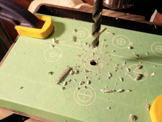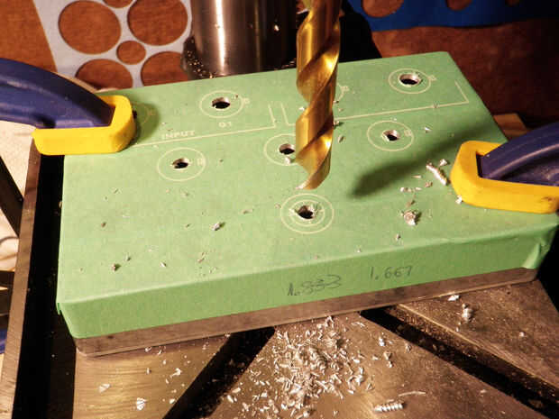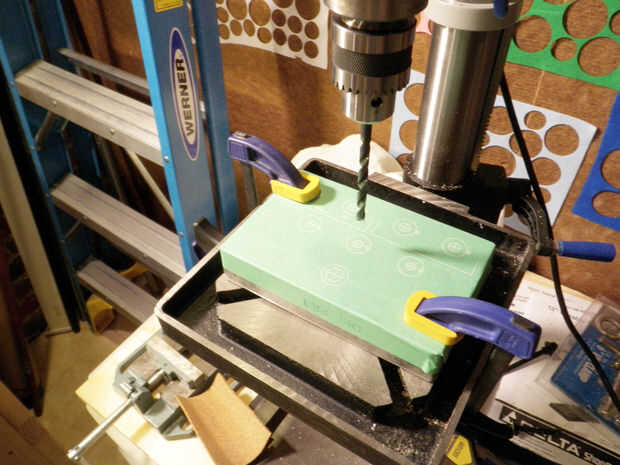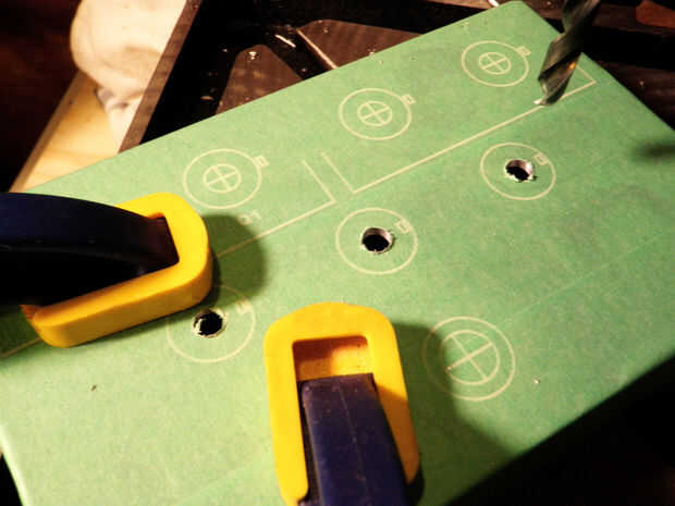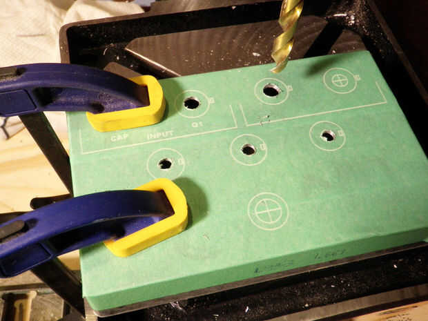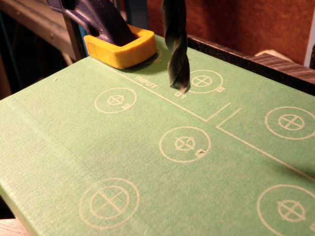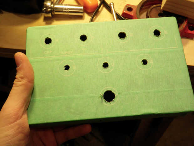 Perforar 3 para los potenciómetros con una broca de 9/32 bits. También uso la 9/32" broca para taladrar un agujero piloto para el interruptor de pedal.
