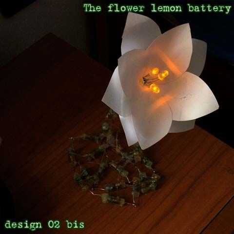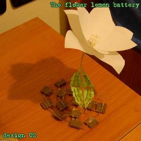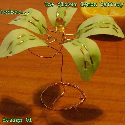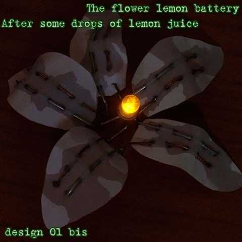 Después de eso voy presentarle el diseño de la batería de flor de limón, en que enciende el led por regar la flor (con gotas de jugo de limón).