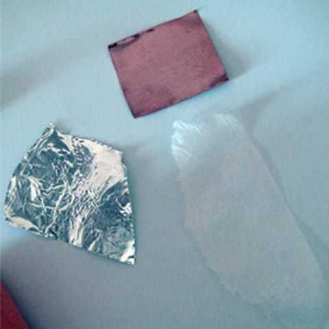 Muy fácil de hacer, sólo cortar un rectángulo de 2x1cm de papel de aluminio, cubrir con papel tissued, envuelto en los bordes; Envuelva el papel un rectángulo más pequeño de alguna hoja de cobre.