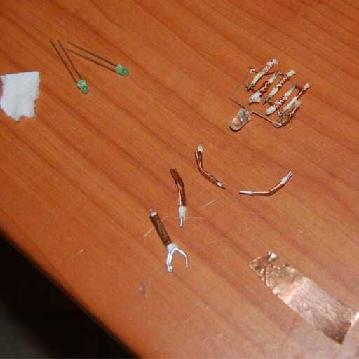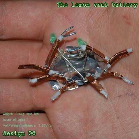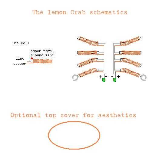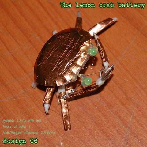 En el detalle, cada pierna/garra/cell es un pedazo largo de 1 cm de alambre de cinc, con una pequeña tira de toalla de papel alrededor de él y una franja más pequeña de hoja de cobre alrededor del papel. Es una celda electroquímica sencilla activada cuando le cae una gota de jugo de limón en ella y el papel se moja, porque se convierte en el electrolito y electrones pueden fluir a través de él.