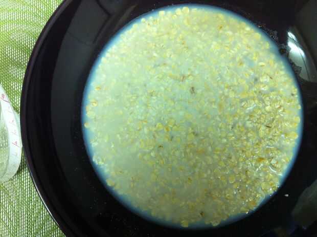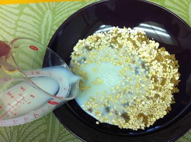Es importante que use un recipiente grande como el ilustrado y que la avena se separan tajantemente entre el tazón de fuente. De lo contrario, la leche se desborde el recipiente, creando un lío oozy en el horno de microondas y dejando su avena cocido incorrectamente.