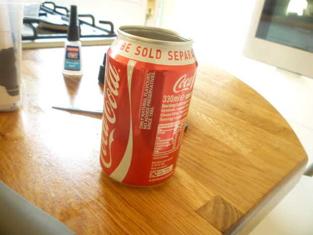 fijar el abrelatas de lata en la cara con lo de la tapa y sacar la cara como lo haría con una lata normal. ahora tendrás una taza. sin embargo, queremos una taza, por lo que tendremos que repetir este paso con la otra taza. poner una de las latas al lado para más tarde.