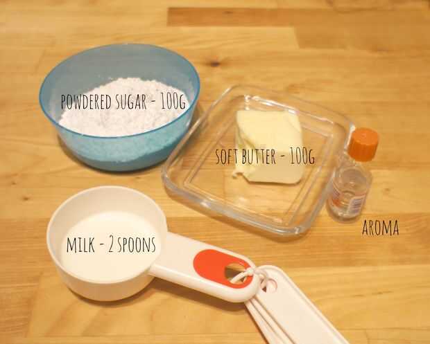 Mezclar la mantequilla blanda con polvo de hornear en crema suave. Agregar el aroma que te gusta y la leche si es necesario