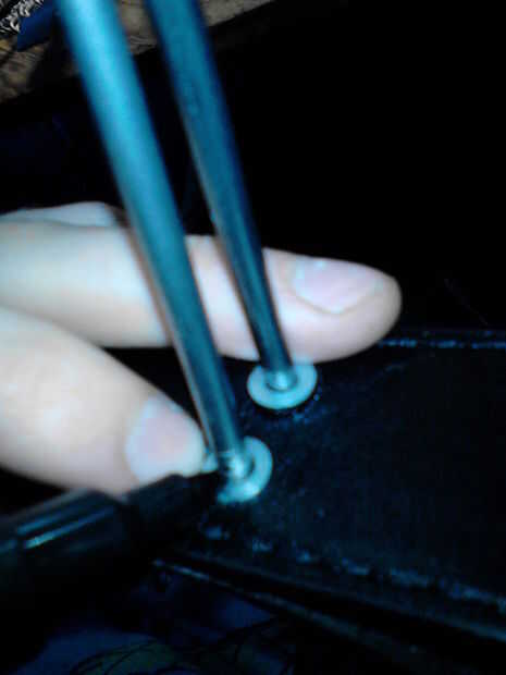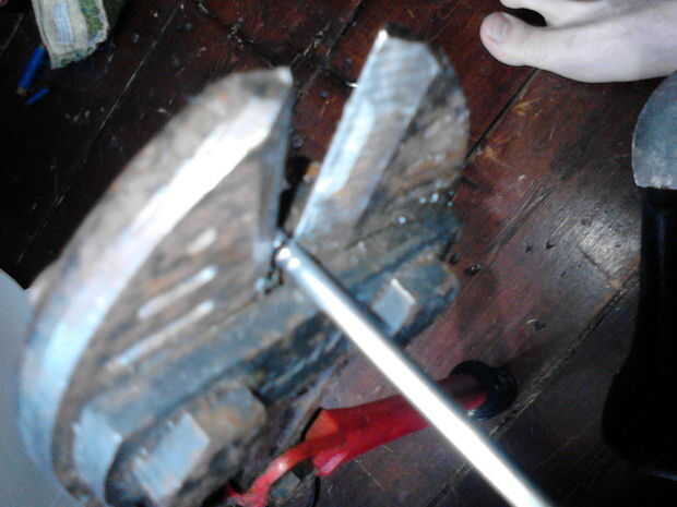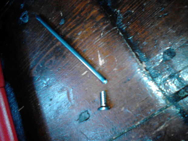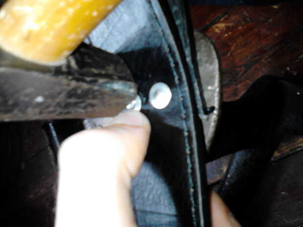 Ahora puedes poner un clavo a través de los agujeros y añada una arandela al clavo y el clavo a la altura de la lavadora de la marca. Tomar su cortapernos, sierra para metales y cortar las uñas a la longitud marcada. Con su rivets(nails) corte a la longitud puede poner a través de los orificios para la correa y añadir a la lavadora, ahora utilizar le martillo y el yunque clavar el cinturón a sí mismo.