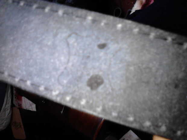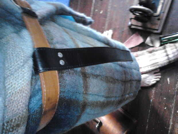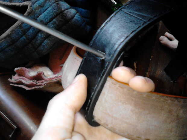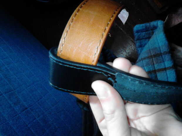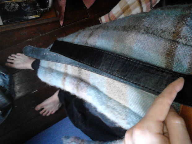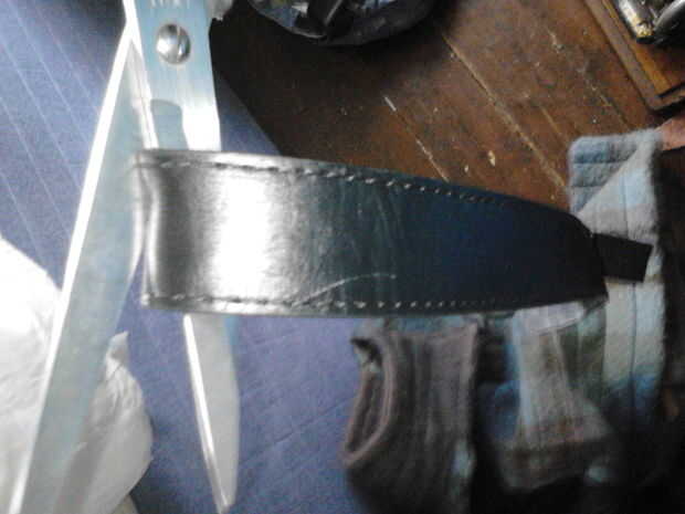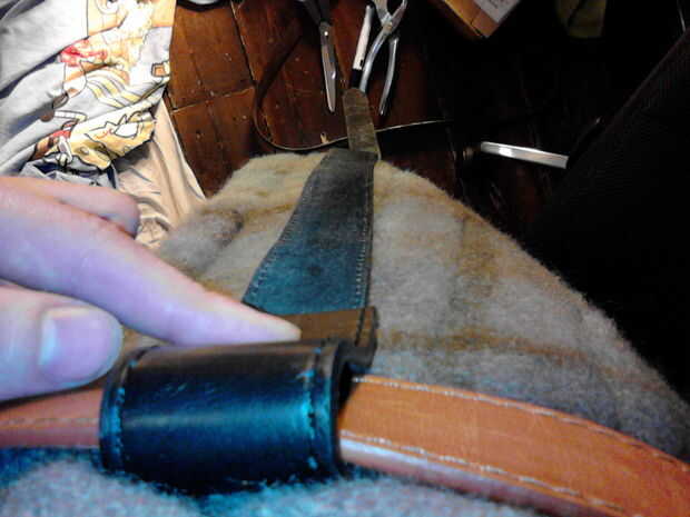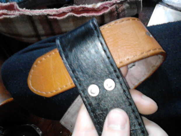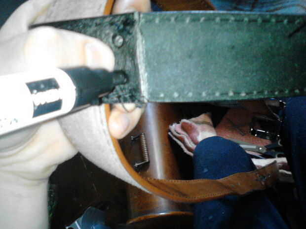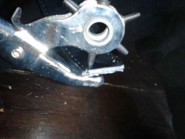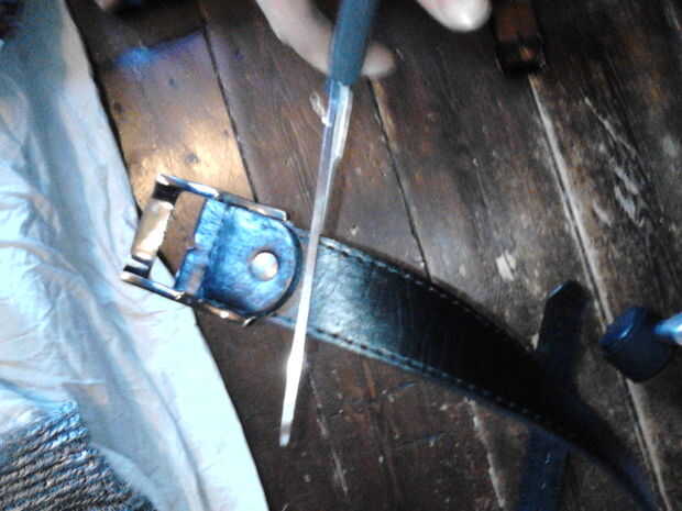 Ahora que se cortan las piezas de metal puede iniciar en las correas. Poner en el cinturón que va a utilizar, corte el buckel y hebilla de la correa vieja por lo que tiene una tira de cuero. Ahora toma un extremo de la correa cortada y Envuélvala alrededor de la correa que lleva para que se superponga aproximadamente 3-4cm (espacio para los remaches).