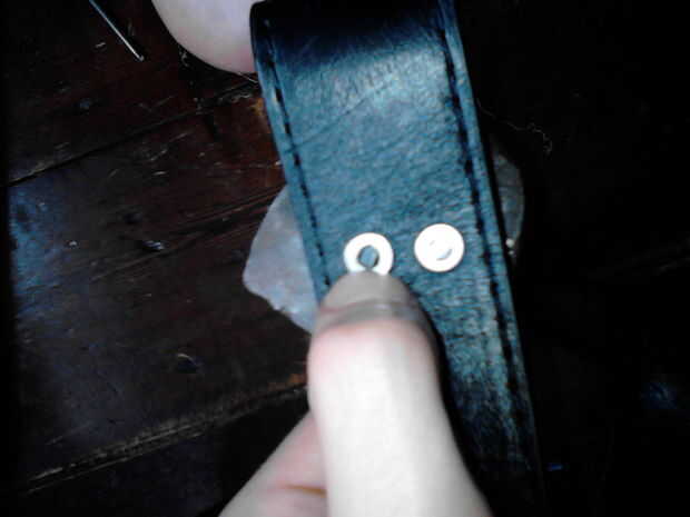 Mi banda fue tiempo suficiente para cortar por la mitad para obtener dos correas, así que encontrar el centro y cortar por la mitad. A continuación dos agujeros en el extremo de la correa, envuélvalo arount el cinturón otra vez y marcar la otra capa a través de los agujeros, estos agujeros.