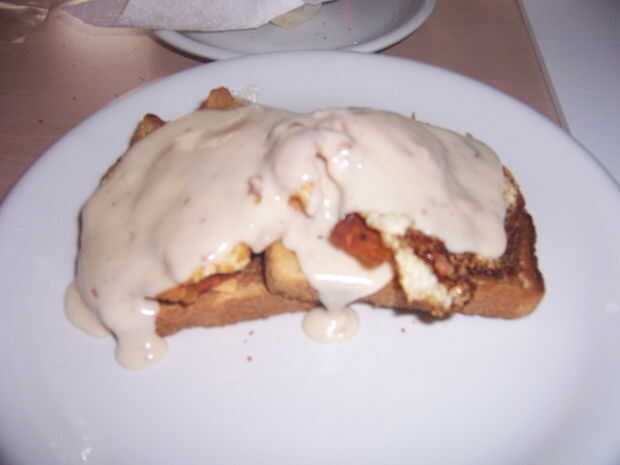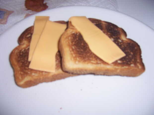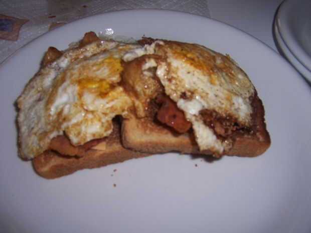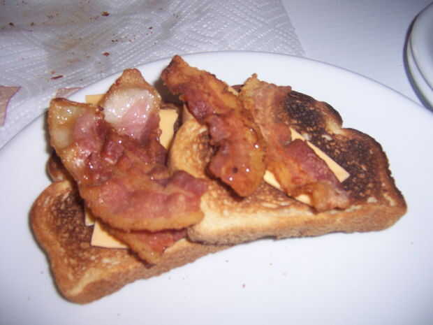a poner todo junto, dejar el brindis como base y rip la rebanada de queso para distribuirlo sobre el pan tostado. A continuación, agregue las rebanadas de tocino y huevos y rematar con alguna salsa (al gusto). Servir con un tenedor, cuchillo de mantequilla y la bebida de su elección (jugo de manzana en mi caso)