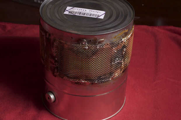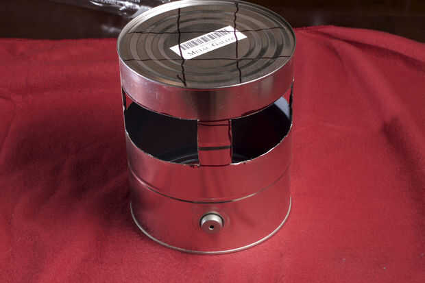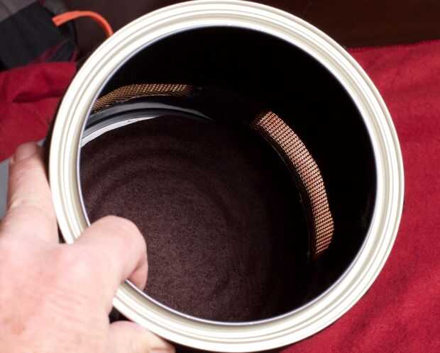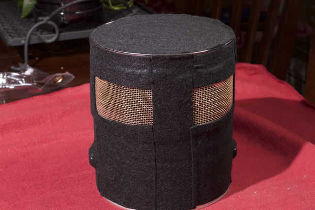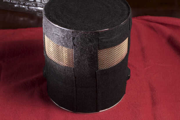 Con las cápsulas en la pintura puede fácilmente podemos ver que las ranuras para el sonido de la tapa deben ser. Tenemos que dejar algunos metales pueden o no ser estructuralmente bastante fuerte. También necesitamos que el sonido llega a cada cápsula. Utilice un rotulador y marque la lata por lo que habrá unos 2" espacio para la pantalla y dejar una pulgada o tan de metal para soporte alrededor de los cuatro cortes. Usé una Dremel con un disco de corte abrasivo para cortar los rectángulos de la lata. Luego corte la pantalla de latón por lo que hay alrededor de 1/2 de superposición a los recortes en el poder. Ahora viene la parte difícil. La pantalla de la lata de soldadura. He usado un soplete de propano pequeño. Utiliza la plomería clase. Probablemente no la mejor opción, pero es lo que tenía. Obtengo alguna práctica la lata más pequeña. Es importante para la soldadura de estos para que exista contacto metal a metal. Realmente estamos haciendo una jaula de Faraday para mantener todo en las conexiones eléctricas son una necesidad. Una vez haya enfriado la lata lava el flujo y procedió a usar Brasso para brillar la pantalla. Luego lavar todo otra vez y lo seca. Cubrí el exterior y los bordes de la pantalla con fieltro negro. Hobby Lobby lleva cáscara y del palillo sentía que es perfecto para esto. También puse fieltro dentro de la lata para amortiguar cualquier resonancia extraña o ecos en la lata. Se ve mucho mejor después del tratamiento de Brasso y fieltro. Aunque se parece al caballero de Monty Python y el Grail santo. Antes de poner la tapa en el alambre de la soldadura un (sobre 12-14inches) a una de las pantallas por lo que podemos todo el conjunto de tierra cuando la tapa está en. Pongo unas franjas de cinta aislante de color roja y amarilla en la lata para que podrian decir del "Derecho de frente" y de "Frente de izquierda".