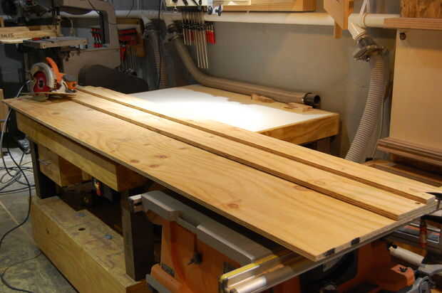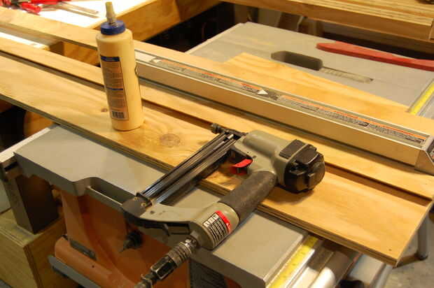 Para las pistas, he utilizado madera contrachapada de 1/2". Rompió la hoja en secciones más manejables con una sierra circular y pista y luego arrancó mi dimensiones finales en la Sierra de mesa. La capa base 7" de ancho y las capas de lado inglete 2" en el lado ancho.