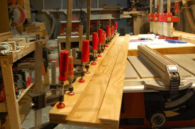 Para unir los lados a la base, utilicé pegamento, clavos del clavito y una plétora de abrazaderas. También utilicé la guía de la Sierra de mesa para mantener una alineación recta, que es importante para un transporte suave corriente. Con el fin de mantener en el sitio opuesto paralelo, he utilizado el carro real como un espaciador.