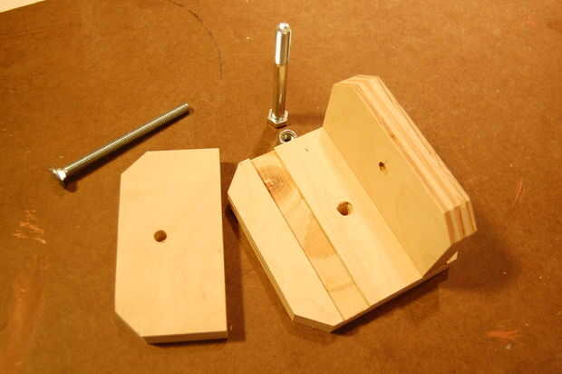 El lado de la base con no surcos, obtiene un agujero central de 1 1/4" de diámetro y 1/2" de profundidad. El agujero entonces se perfora a través en 3/8". Los lados Haz un agujero de 5/16" 1" hacia arriba desde la parte inferior y el centro de la anchura total.