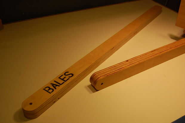 Los brazos de los auges son una laminación de dos capas de madera contrachapada de 3/4". Cualquier inclinación en la madera fue enfrentada hacia el interior, pegada y afianzado con abrazadera. Una vez seco, se arrancó a 2" de ancho y cortaron a deseado longitud. Se hace una marca en cada extremo... 1" en cada lado... y un arco se realiza utilizando una brújula. Taladro 5/16" a través del agujero en la marca y luego corte arena su arco.
