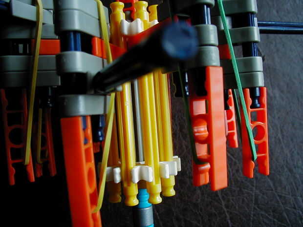 Conectar los barriles para el cuerpo. Utilizar un patrón alterno para decidir lo que pasa en frente. Deslice los barriles al frente del cuerpo tanto como puedas. Los conectores naranja fijar a las barras amarillas.