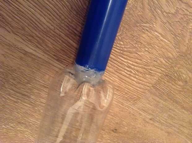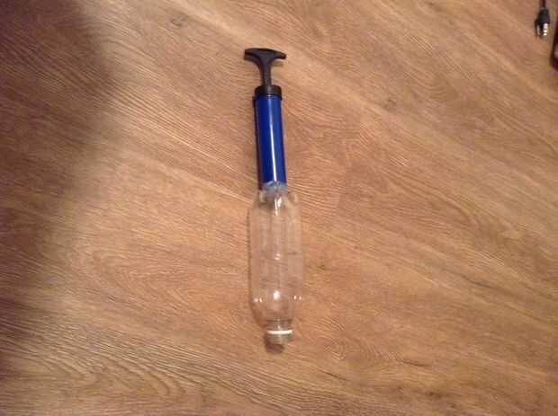 Este es un paso fácil. Sólo tome su botella y su inflador de pelota, luego empuje la aguja infladores dentro del agujero que es perforado en la parte inferior de la botella. Un montón de pegamento caliente se debe poner alrededor de esta conexión, no sólo a hacer herméticas al aire, sino también para que el inflador se mantendrá firmemente en la parte posterior de la botella.