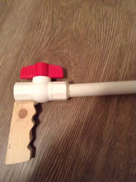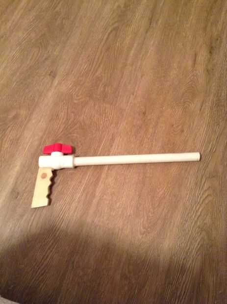 Ahora toma el tubo de pvc y la válvula de bola y conectar los dos usando pegamento caliente. Pegamento caliente es necesaria porque el tubo no absolutamente caben firmemente dentro de la válvula de bola. Asegúrese de que pegue el cañón en el estrecho. También he hecho un mango de madera para esta pistola como se puede ver. Para tiene algunos restos de madera y una sierra para metales. Y entonces tal vez algunos papel de lija para suavizar hacia abajo luego. Pegué mi agarre para la base de la válvula de bola, pero ser creativo con sus diseños de la pistola.
