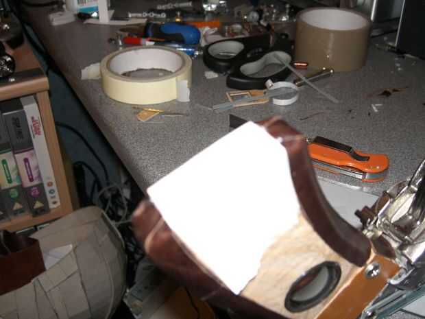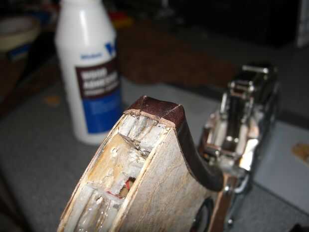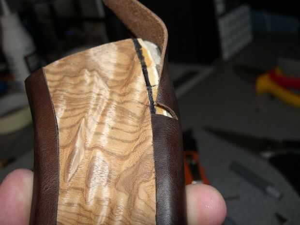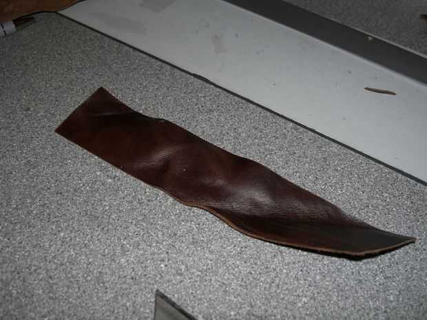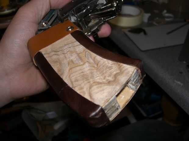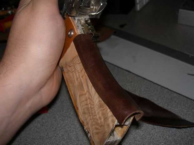 Finalmente cortadas algunas tiras de cuero y pegar cuidadosamente sobre las secciones expuestas de la manija, me parece que si Unte pegamento PVA en el cuero hacen ligeramente húmeda que le permite 'molde' alrededor de la manija mejor, cortar el cuero donde es necesario y doblar en la parte inferior de la manija.