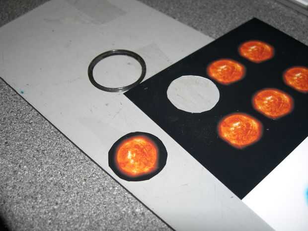 Tengo un pequeño lente de una cámara, la lente todavía tenía su envolvente metálica, utilizando estos i google unas fotos del sol, encontró uno me gustaba e imprimir en papel brillante. Que cortar esto y había atascado en el orificio.