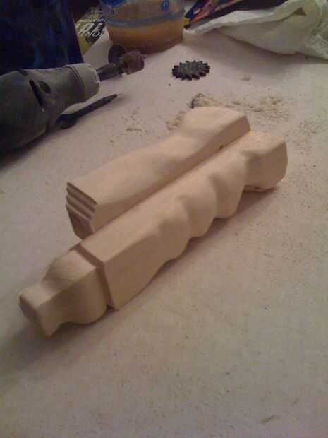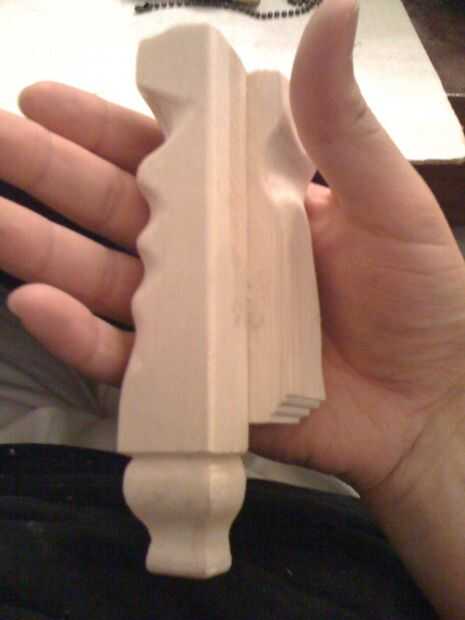Ahora sostenga las dos esquinas de madera en su mano como si fuera el mango de una pistola y traza la ubicación de los dedos y la palma a la madera. Esto le dará a una guía para su lijado. Use su lijadora de mic que acaba de realizar y poco a poco empezar a pulir el agarre hasta que su mano encaja perfectamente en las arboledas que has hecho. Asegúrese de que usar la esponja de lija para suavizar todo y hacerlo sentirse y verse bien.