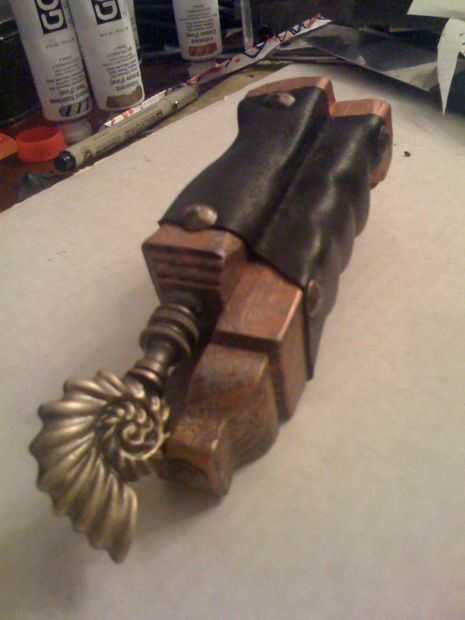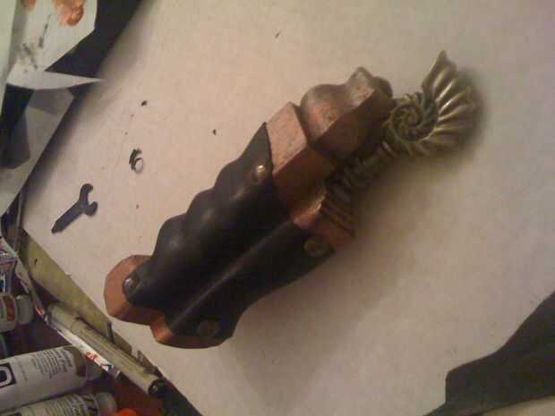Cepillo una capa sólida de acero pintura en la empuñadura de color, dejar seco, luego Inicio seco cepillado cobre y bronce por separado hasta parece vieja manchada cobre. Una vez que se seque totalmente, luego tomar su piel, algunos epoxi de dos partes en la parte posterior del cepillo para que cada parte está cubierta. Hazlo rápido porque se fijó en usted si usted no tiene cuidado. Inmediatamente Presione la superficie de cuero mojado su asidero cuidadosamente donde usted lo desee y paquete en las grietas. Sostenga hasta que cuaje.