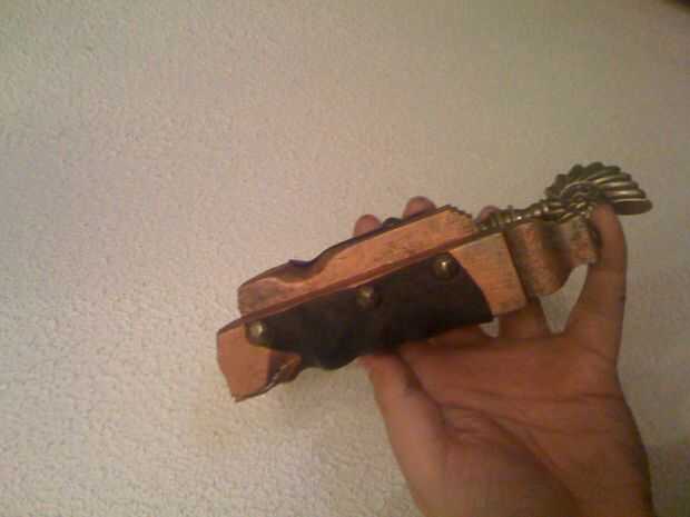 El primer paso es trazar la forma de la empuñadura de cuero. Tomar su plaza de cuero y envuélvalo arounf la manija, introduciendo el material en todos los rincones y grietas. Use un marcador para trazar la forma que desee en el cuero, luego retirarla y corta. Asegúrese de que los bordes estén limpios. Luego tomar esa forma y presione hacia atrás el mango y traza la forma sobre la madera con un lápiz. Ya sabes donde será tu piel, y es importante no pintar demasiado terriblemente en esa forma. Tienes que superponer los bordes de esa forma un poco.