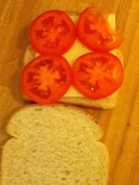 Paso 2: Cortar el tomate en rodajas de círculo y colocar a cuatro de ellos en la cima de su queso. (Podrá necesitar más o menos, sólo rellenar la superficie)
