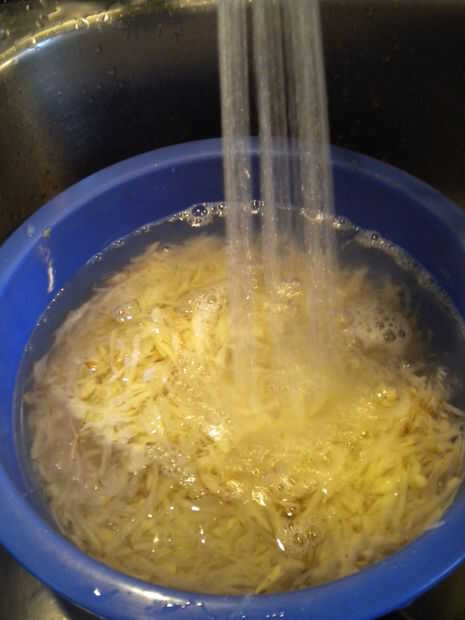 Rallar las papas con el rallador de la caja (Foto 1) y lavar en agua fría 2 - 3 veces (cuadro 2).
