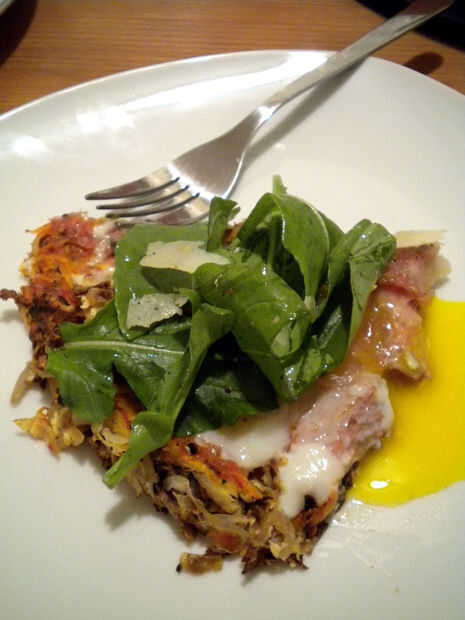 Mi pizza de Brunch puse lonchas de prosciutto, rúcula fresca, virutas de parmigiano reggiano, aceite, sal y pimienta.