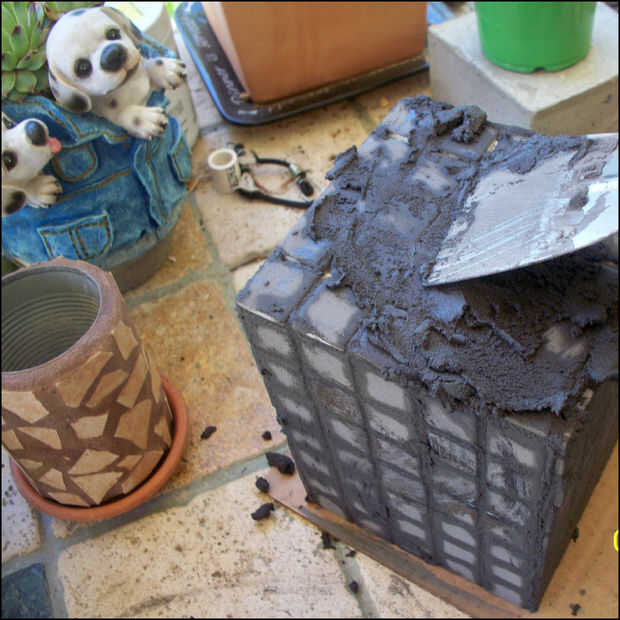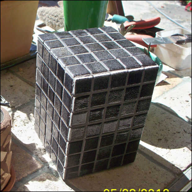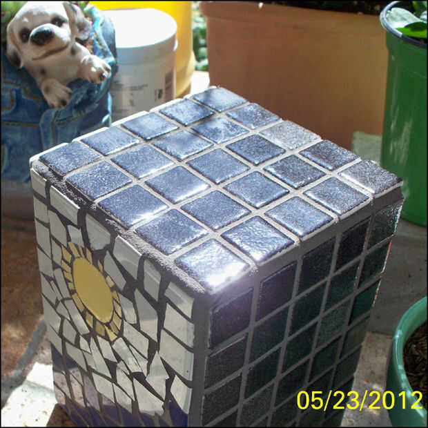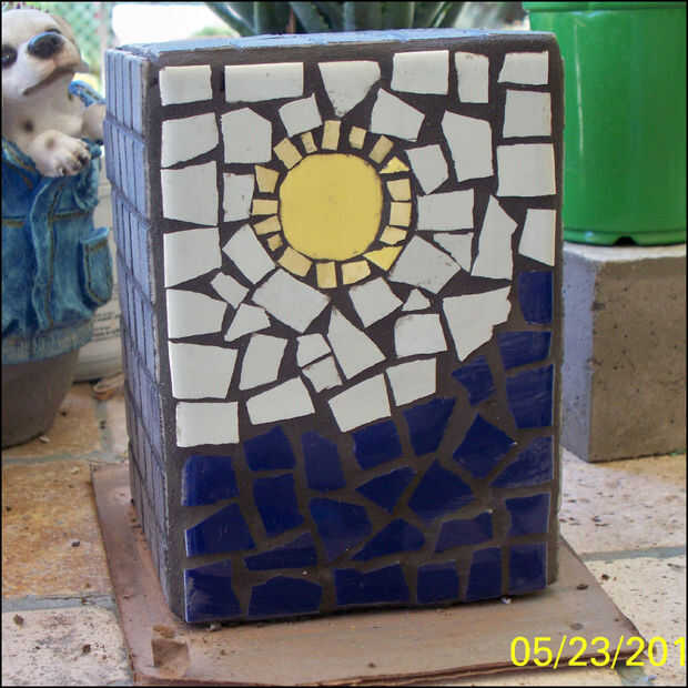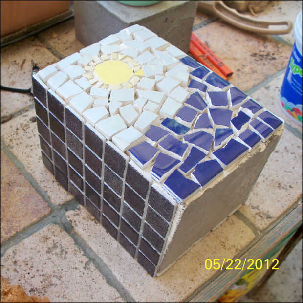opté por una lechada de carbón o negra de la mayoría de lo soporte de baldosas. En un lado de ese soporte, hice una escena de mosaico de sky, agua y sol.  La parte azul oscurezca fue lechada con una lechada gris más clara, para mejor contraste.
