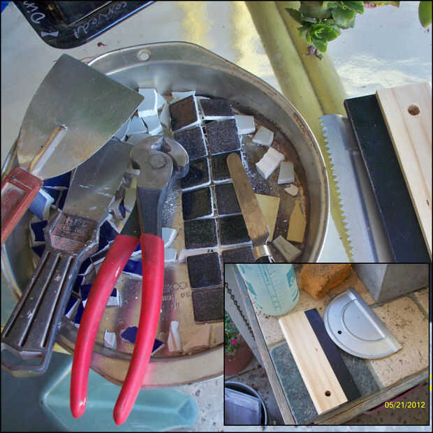 Las herramientas de manejo concreto generalmente se utilizan y los materiales para la decoración de los stands son variados y numerosos. Para estos proyectos, usé vidrieras, granos de cristal, azulejo de vidrio, cerámica y azulejo del travertino. Mayoría del material que tenía en mano, a la izquierda encima de otros proyectos por lo que es una buena manera de usar lo que tienes y no desecho nada.